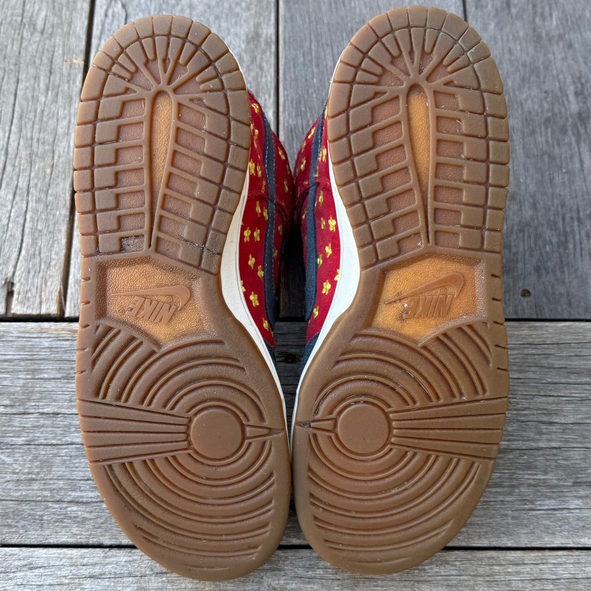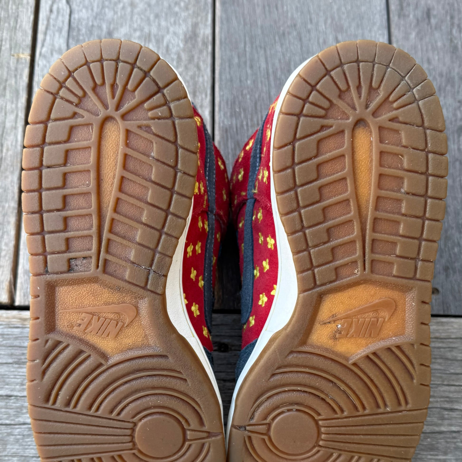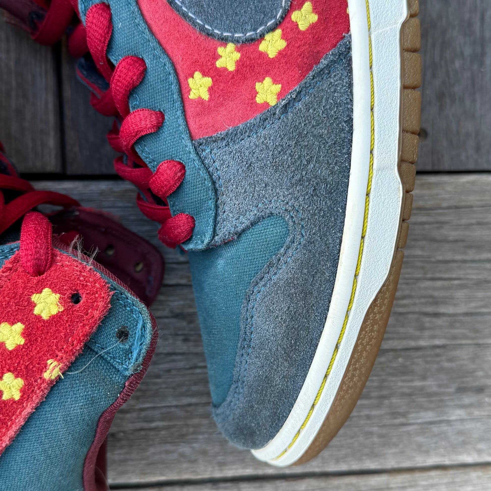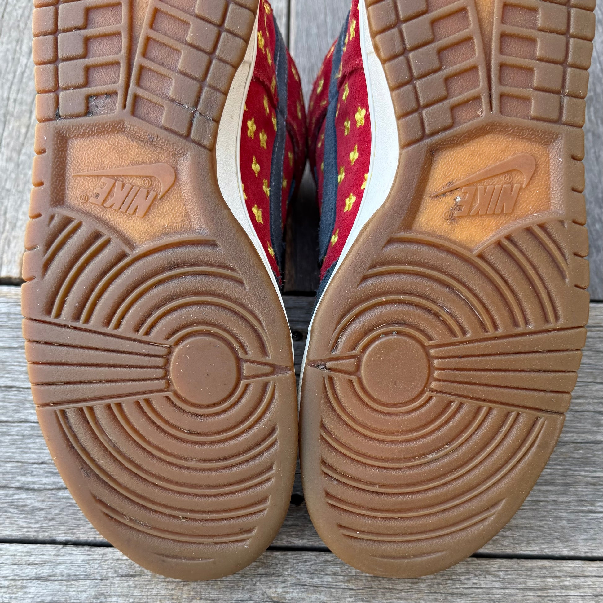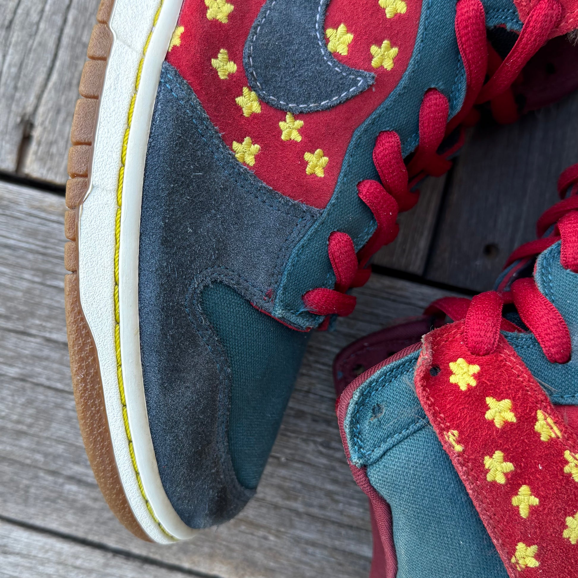 Worn condition! Some marks/wear throughout the uppers. Some wear on the heel panels, as shown. Some wear on the left midsole, as shown. Looks like previous owner tried gluing the flaps down. Bottoms are in solid condition.