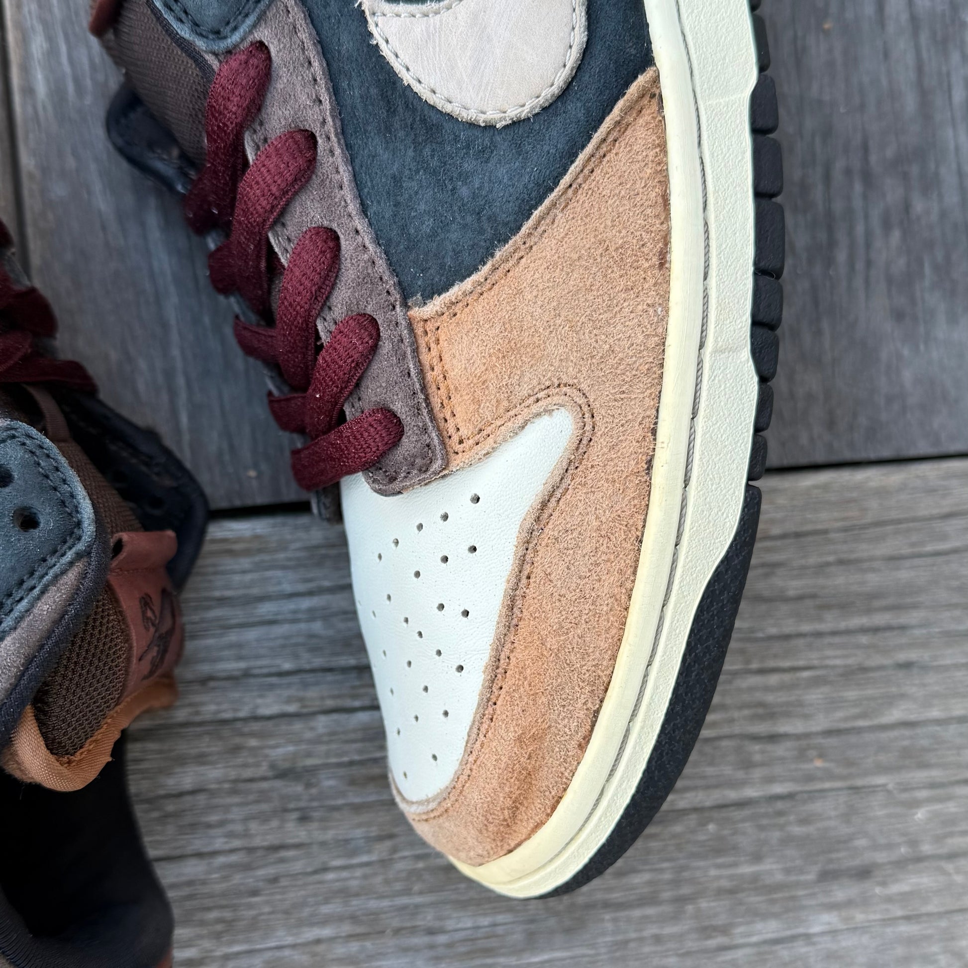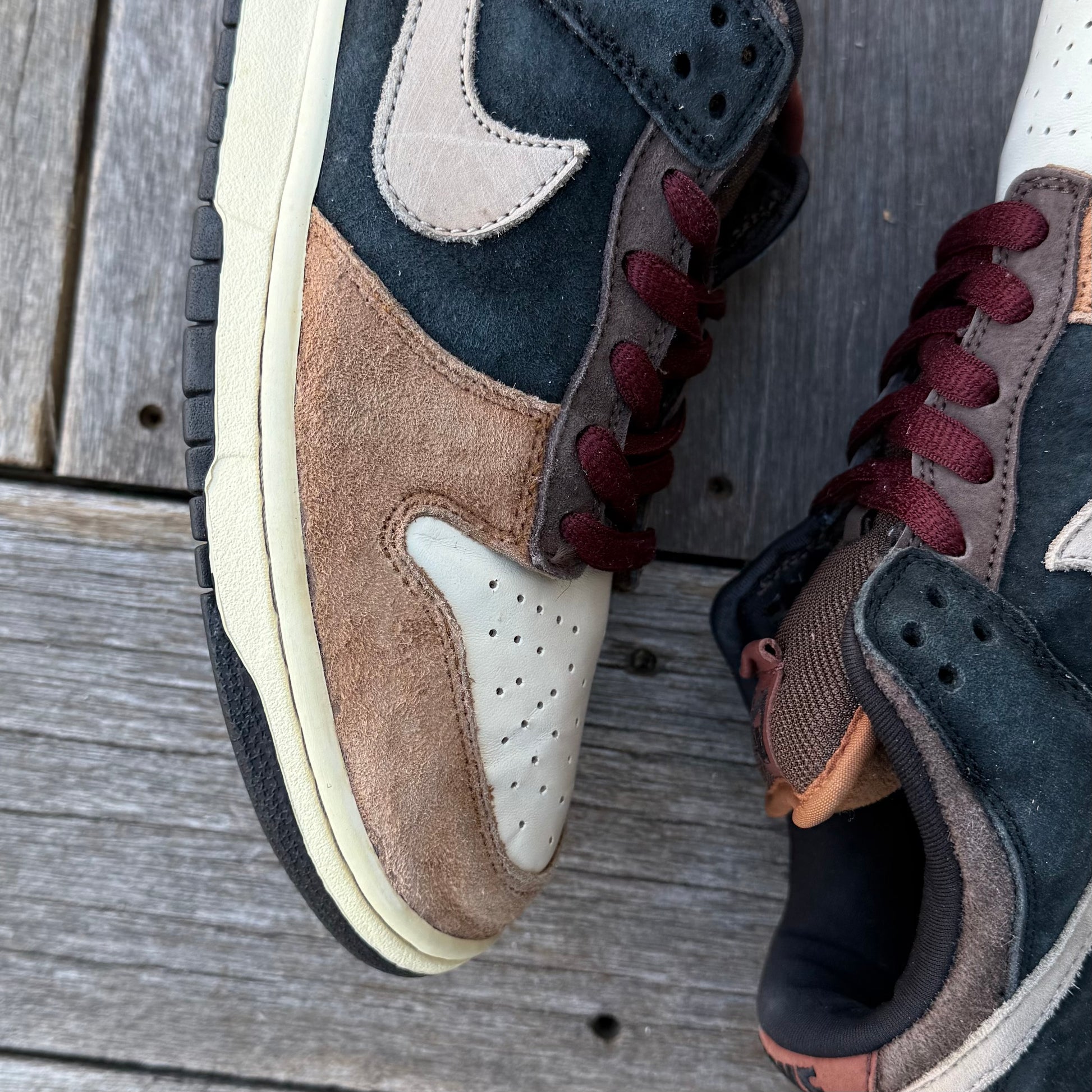 Worn condition! Some marks/wear/fading throughout the uppers, as pictured. Looks like previous owner attempted a reglue. Bottoms are in solid condition— a bit slick, but still flexible/wearable.